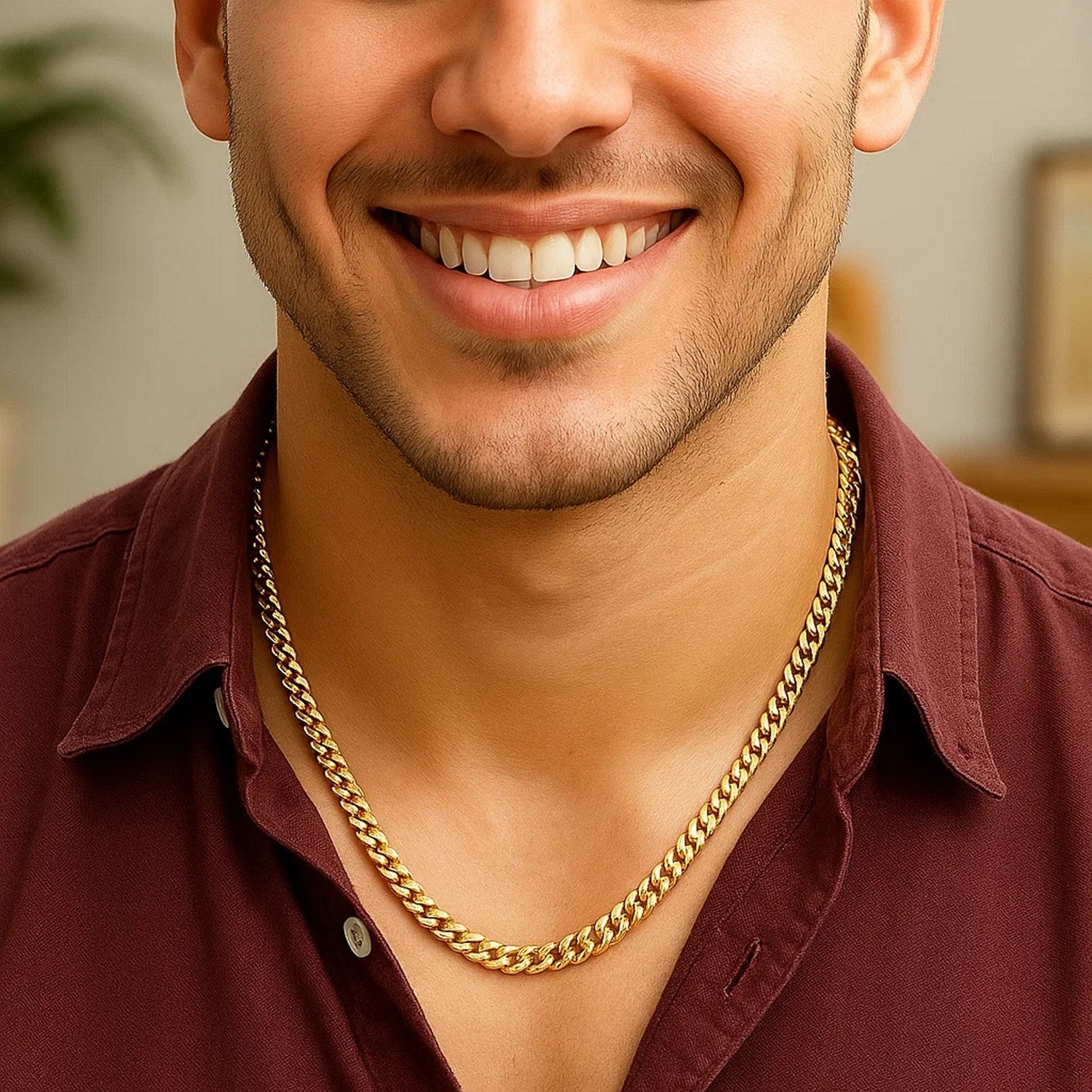 This semi solid Miami cuban chain comes in 14k yellow gold and has a width of 5.0 millimeters.